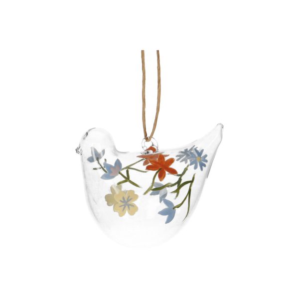 Transparant glazen paashanger in de vorm van een lief vogeltje met handgeschilderde bloemen. Dat staat prachtig in een vrolijke paastak! Erg mooi in combinatie met onze andere glazen paashangers en decoraties van vilt en papier.