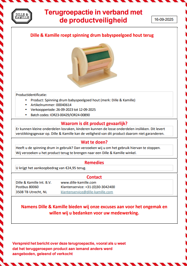 Heb je de belcilinder babyspeelgoed hout bij ons gekocht in de periode van 5 oktober 2023 tot 6 december 2023? Breng het dan terug in onze winkel of neem contact op met onze Klantenservice op 030 3042400 of klantenservice@dille-kamille.com. Je krijgt uiteraard het aankoopbedrag van € 7,95 van ons terug.