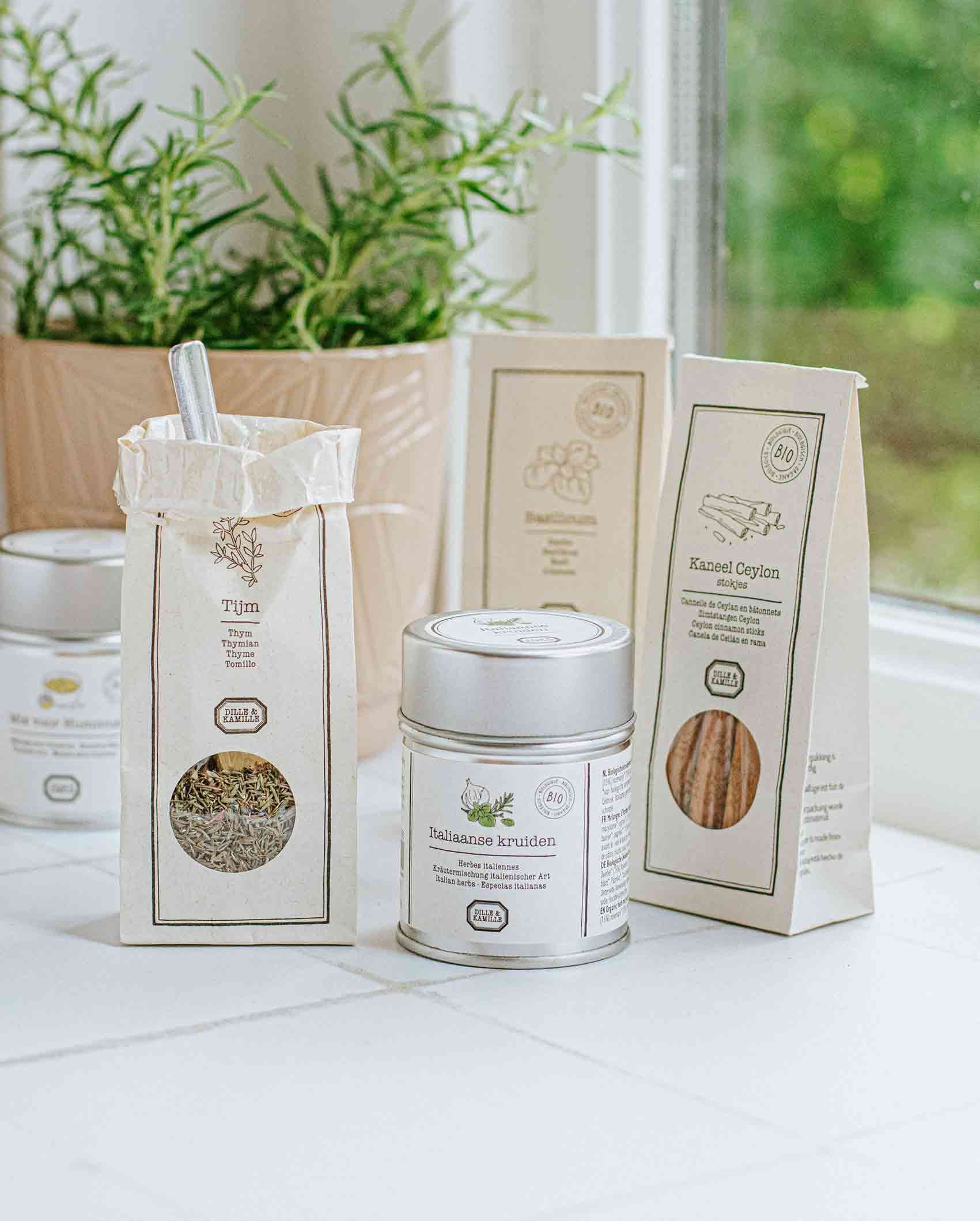 Door dit ruime aanbod vind je bij Dille & Kamille niet alleen de klassiekers, zoals zwarte peper, basilicum, kaneel en nootmuskaat, maar ook verrassende kruidenmixen zoals bijvoorbeeld een mix voor smoohies of chai lattes, granolakruiden, patatas bravas mix, een mix om guacamole, hummus of aïoli mee te maken en nog heel veel meer!
