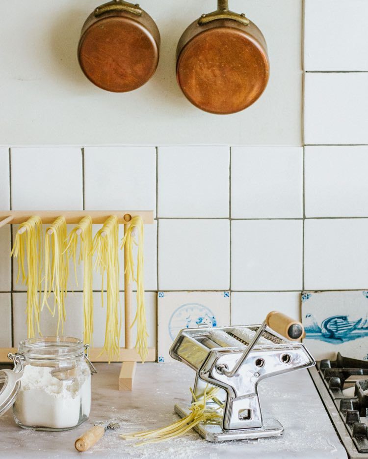 Er zijn twee dingen heel erg belangrijk als je pasta maakt: zorg dat je de tijd neemt, en dat je de pasta goed droogt – zodat de slierten niet aan elkaar gaan plakken. Gebruik hiervoor ons handige pastadroogrekje!