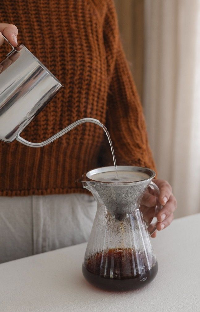 *Bloomen is belangrijk: het voorkomt bitters en zuren en het water kan de koffie beter en gelijkmatig opnemen.