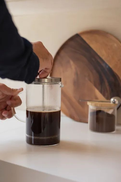- Laat de koffie 4 minuten trekken, zet dan de het deksel van de French press op de kan en duw langzaam naar beneden.
