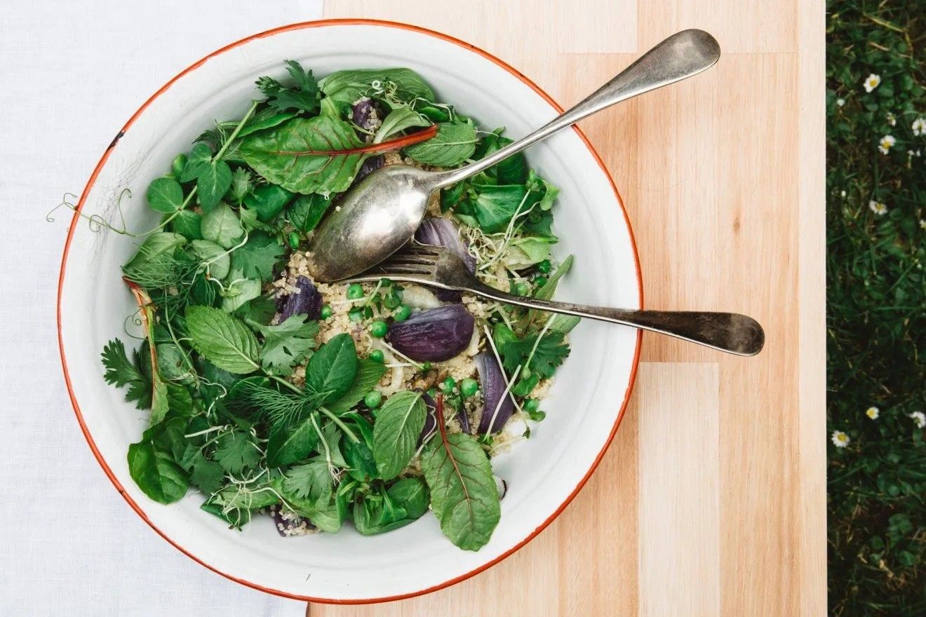 - bladgroen uit de moestuin: erwtenscheuten, koriander, munt, dille kiemgroenten zout en versgemalen zwarte peper
