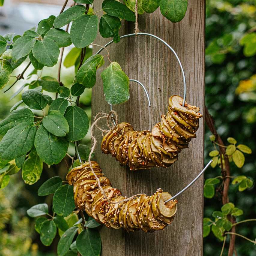 In de winter kunnen de vogels die je tuin of balkon bezoeken wel wat extra voedsel gebruiken. Met deze DIY maak je ze blij met een voedzame combinatie van gedroogde appelschijfjes, kokosvet en verschillende zaden.