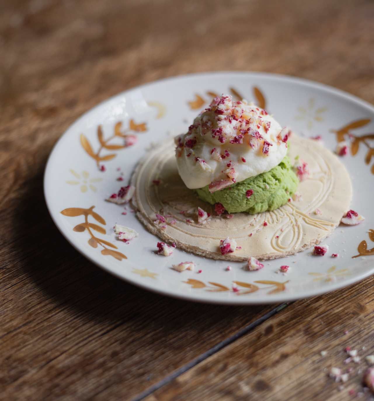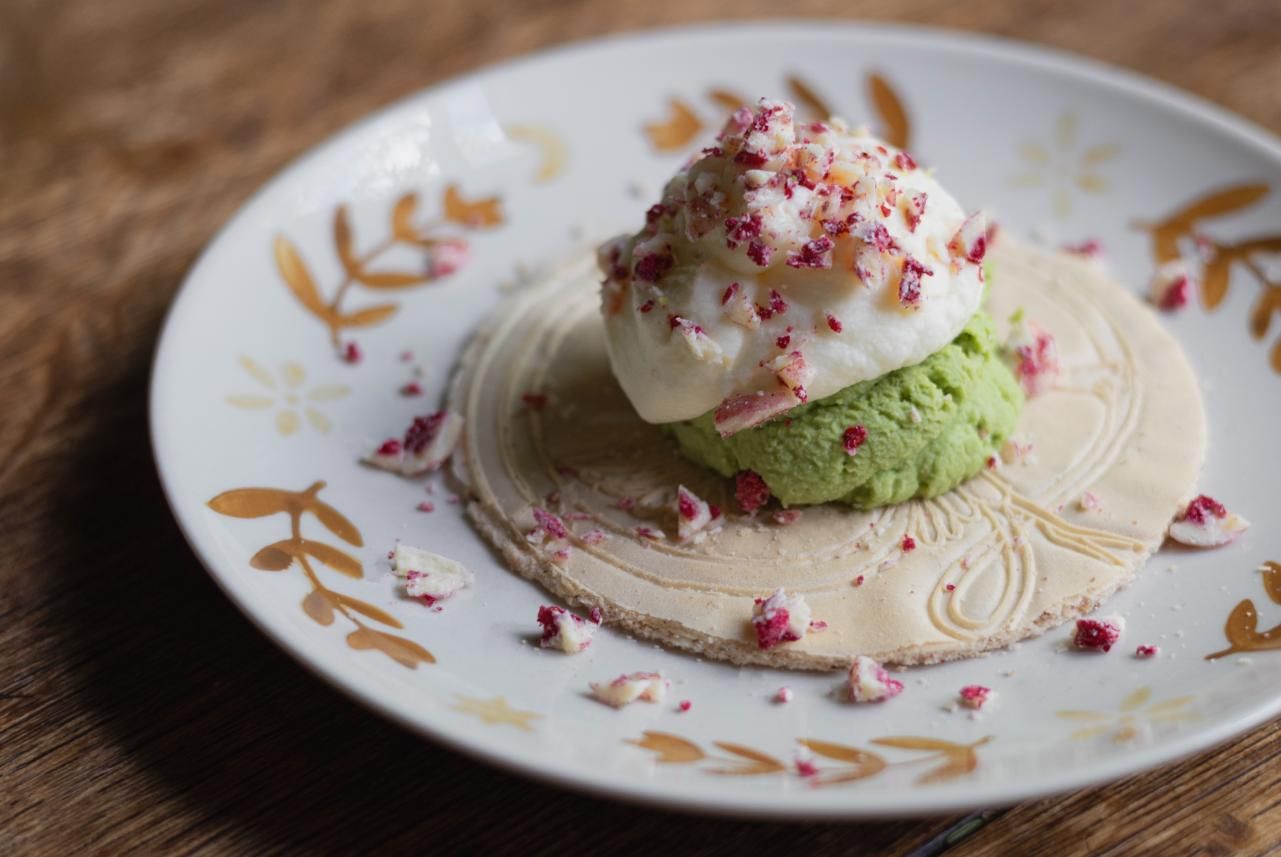 Mousse met matcha en een heerlijke amandelwafel als eetbaar schoteltje: laat je verrassen door de kleuren en smaken van dit prachtige dessert!