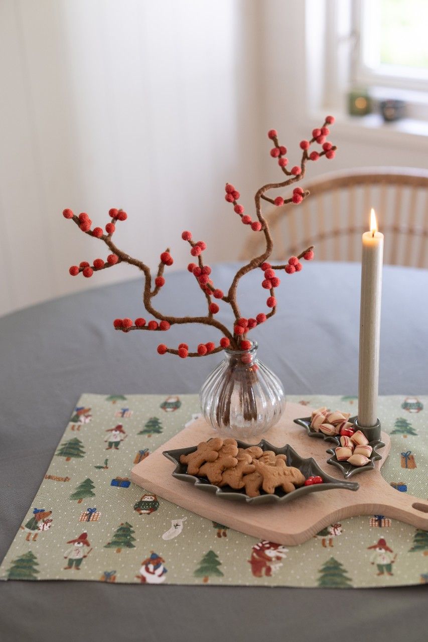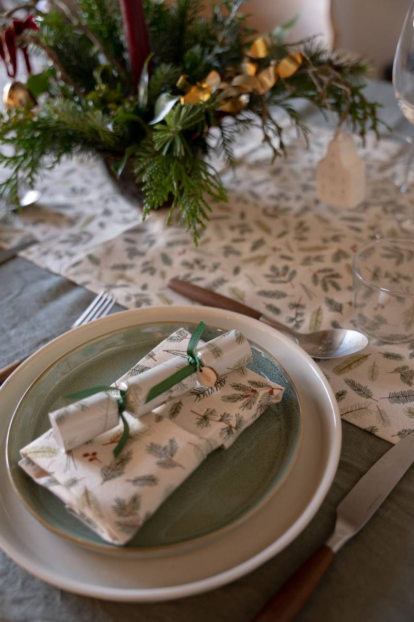 Voor het echte kerstgevoel kiezen wij met kerst voor tafeltextiel in de traditionele kleuren rood en groen. De basis van deze tafel is het tafelkleed met een print van dennentakjes. Of kies voor een wit tafelkleed als basis, met een tafelloper of servetten in deze print.