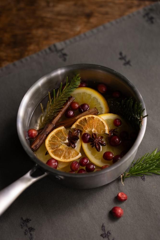 Met een paar dennentakjes, specerijen en sinaasappelschijfjes maak je eenvoudig een winters geurpannetje (of simmer pot). Voor een heerlijke, natuurlijke geur in huis!