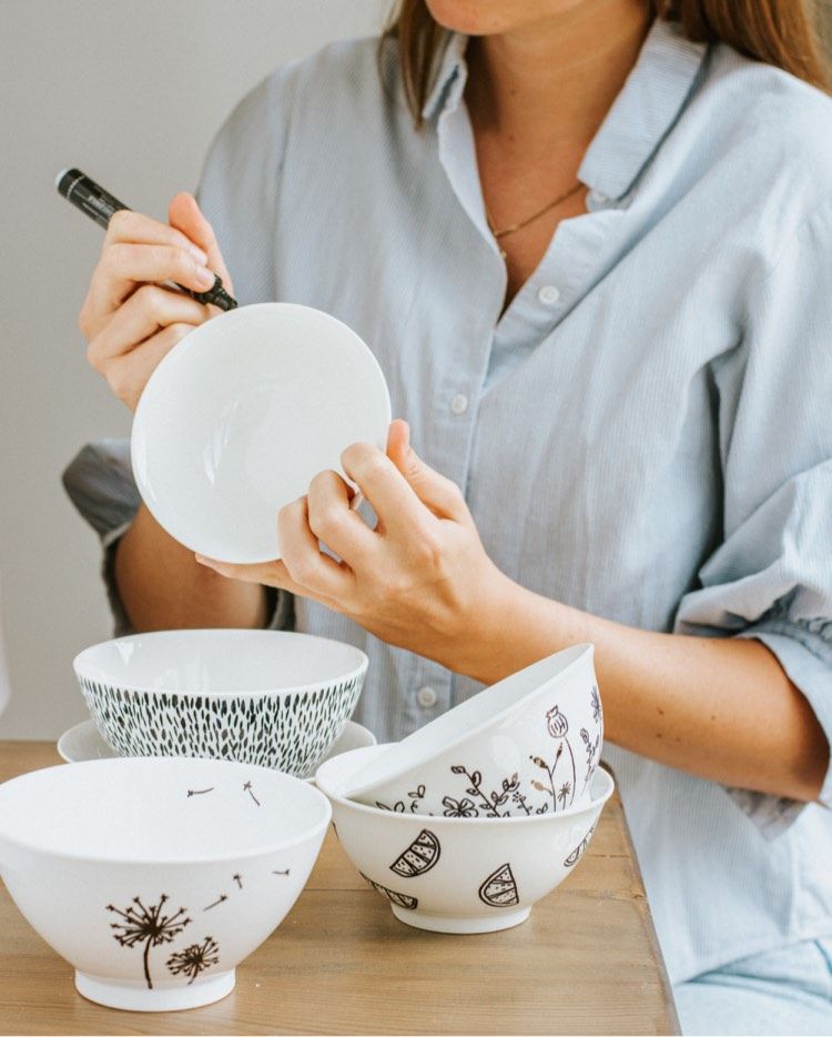 Pak je (witte) servies en gebruik een handige penseelstift die geschikt is voor porselein (te koop bij je favoriete hobbywinkel). Zorg ervoor dat de stift een flexibele punt heeft en geschikt is voor allerlei oppervlakten: keramiek, glas, porselein... Vervolgens ga je tekenen. Doe inspiratie op aan deze foto of kijk eens rond in je omgeving en de natuur. Veel plezier!