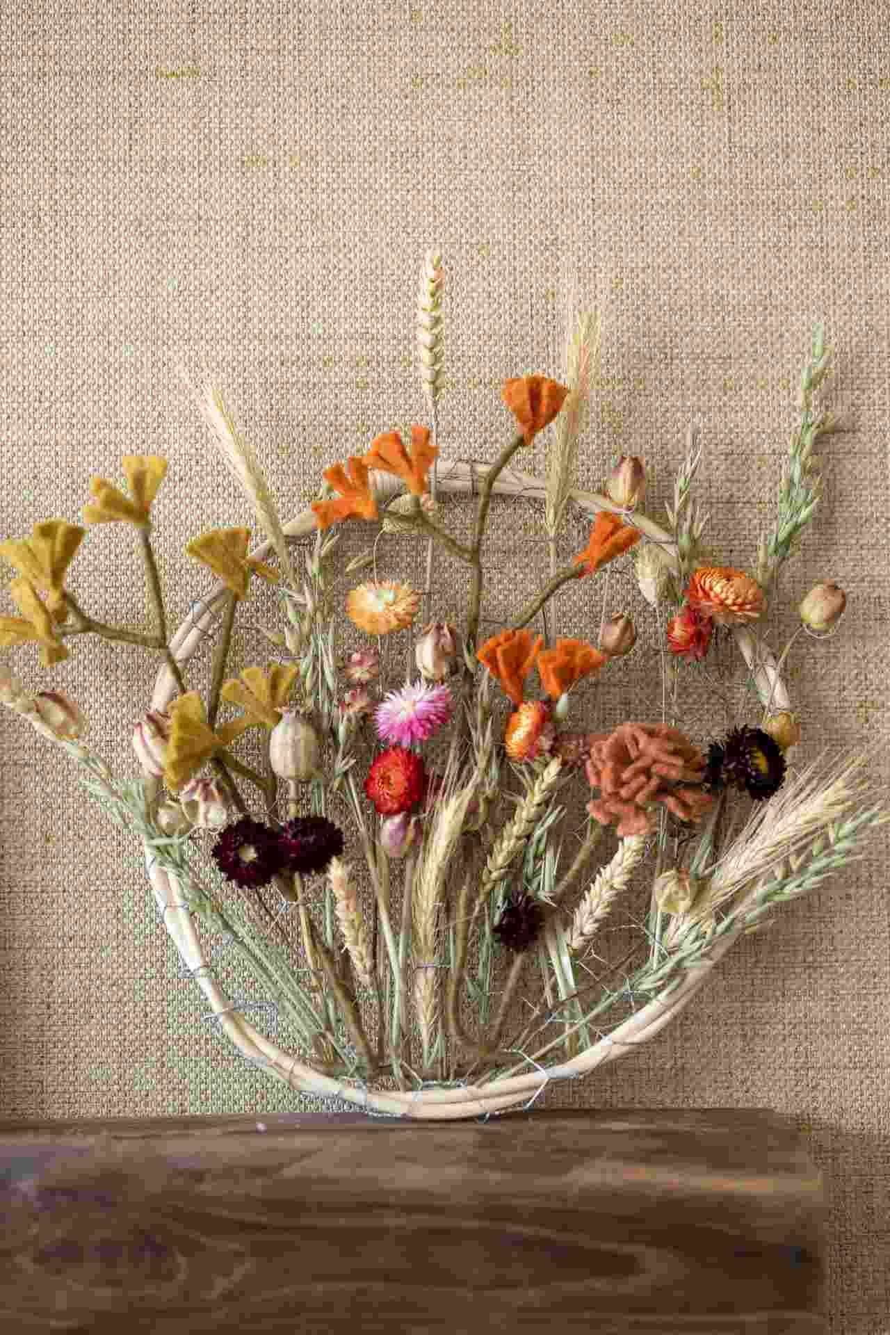 Met vilten bloemen, droogbloemen en kippengaas maak je heel eenvoudig een bloemenkrans met een natuurlijke uitstraling. Een echte blikvanger, waar je lang plezier van hebt!