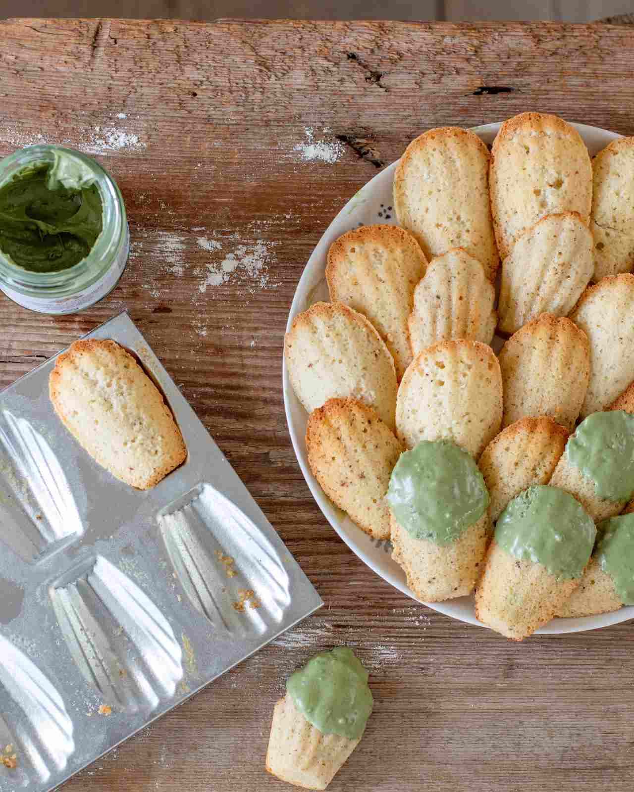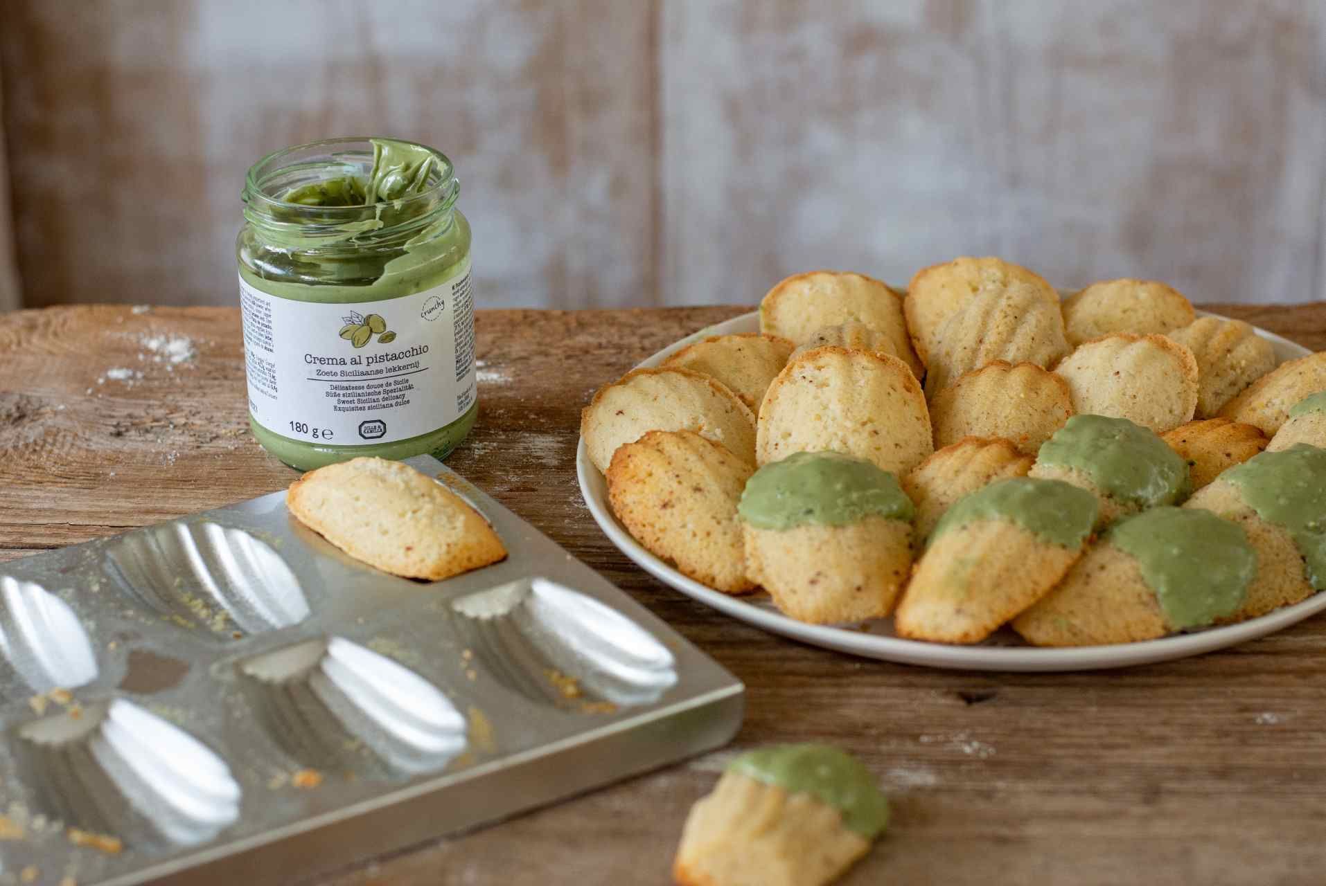 Variatietip: vervang het vijfkruidenpoeder door 1 tl vanille-extract* en doop de madeleines, als ze zijn afgekoeld, in crema al pistacchio*. Decoreer met verkruimelde pistachenootjes.