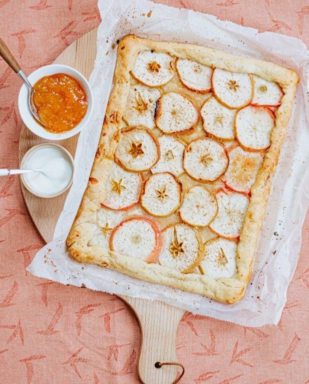- Leg de schijfjes appel naast elkaar op het deeg. Laat de randen vrij en vouw deze naar binnen (een beetje over de appelschijfjes).