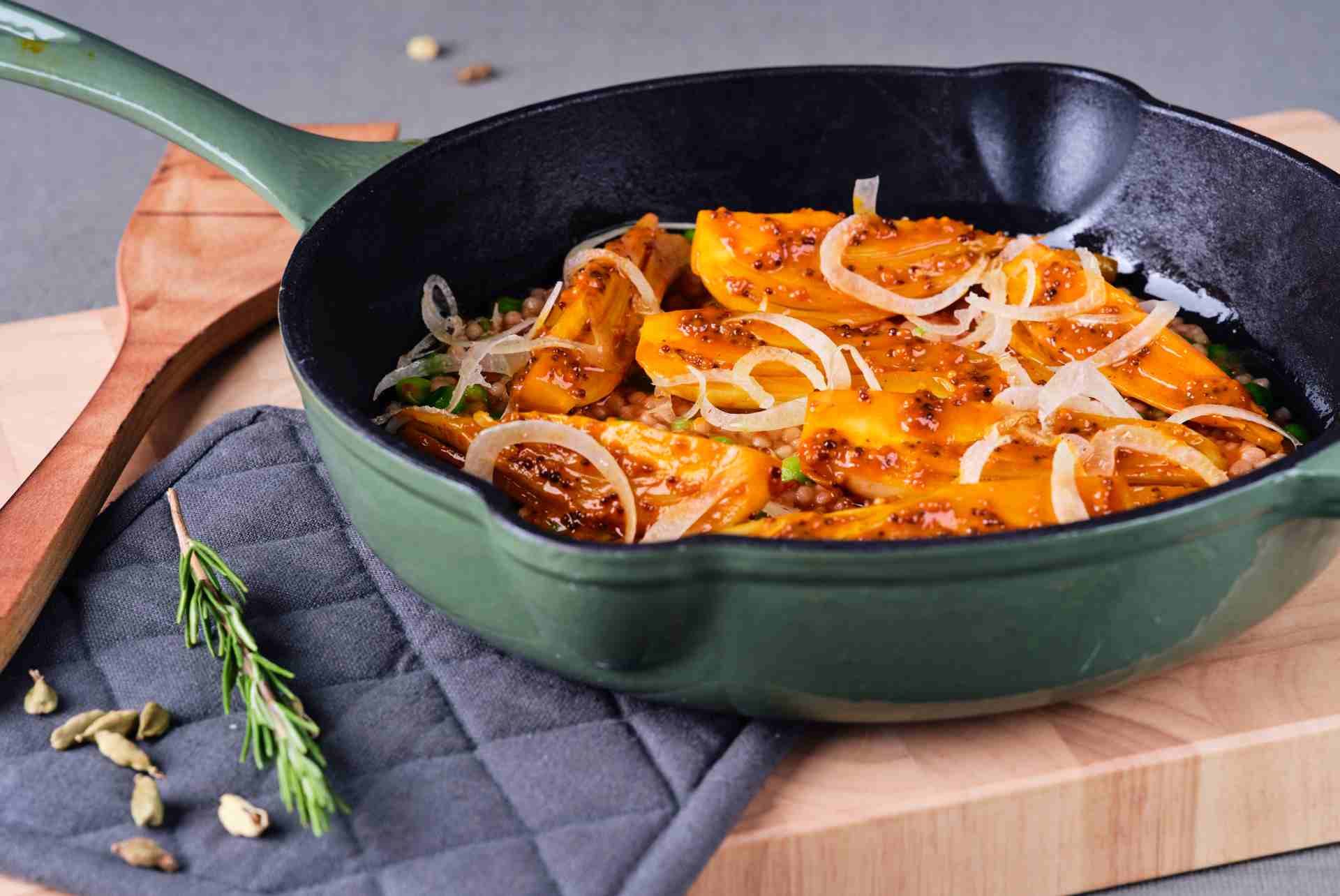 - Haal de pan van het vuur en schep met een lepel het wortelsap over de venkel.