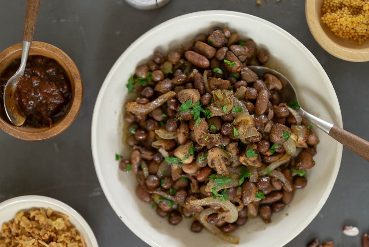 - Giet de bonen af, doe in een schaal en meng met de uien en champignons. Breng op smaak met zeezout.