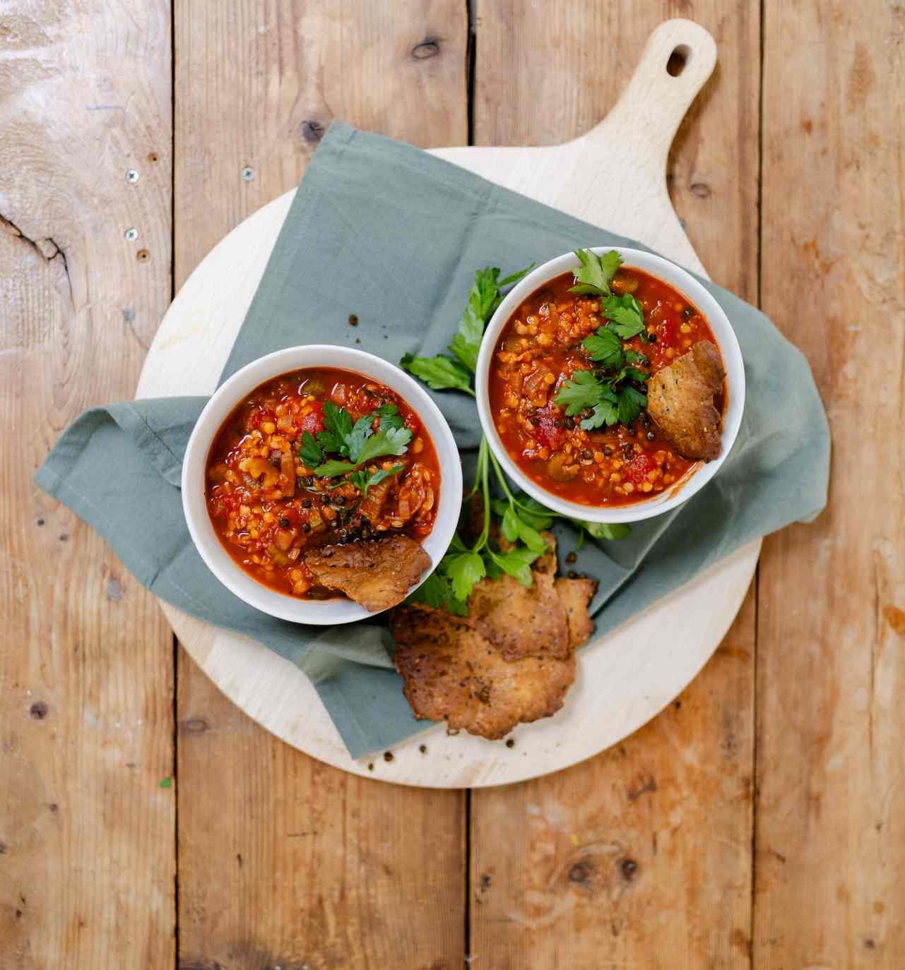 - Schenk de tomatendadelsoep in kommen en garneer met bladpeterselie.