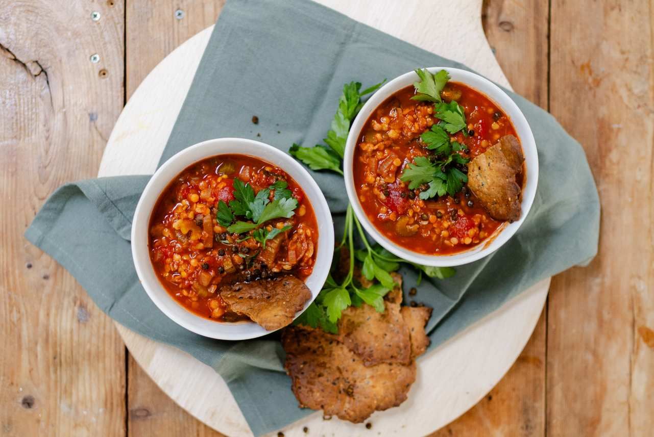 - Schep de rode linzen en tomaten (met sap) erdoor en breng het geheel aan de kook. Druk de tomaten stuk met een spatel.