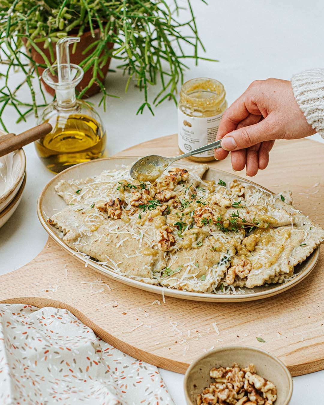 Leuk om zelf te maken (en heerlijk om vervolgens op te eten): pasta gevuld met spinazie en pompoen. De walnotensaus die je op het laatst toevoegt, maakt de pansotti nog lekkerder!