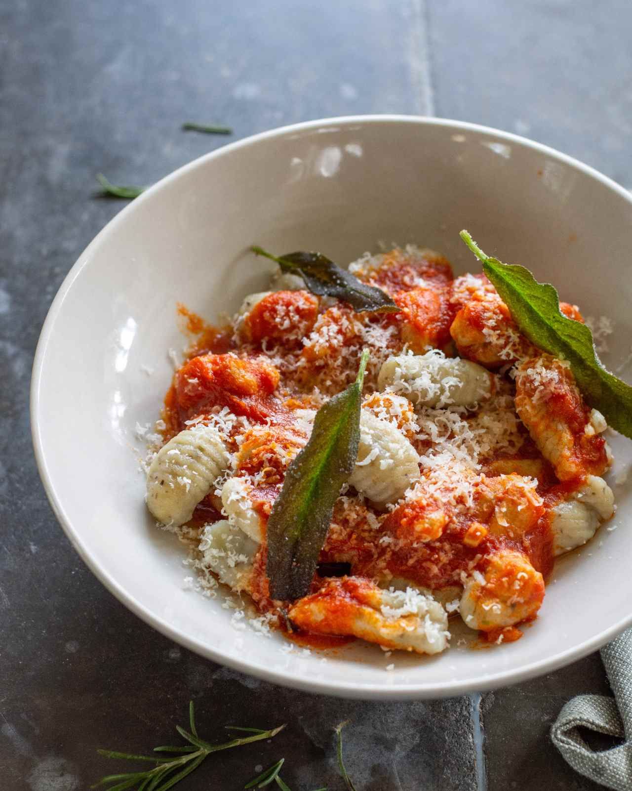 - Serveer de gnocchi met de tomatensaus, Parmezaanse kaas en een paar blaadjes (gefrituurde) salie.