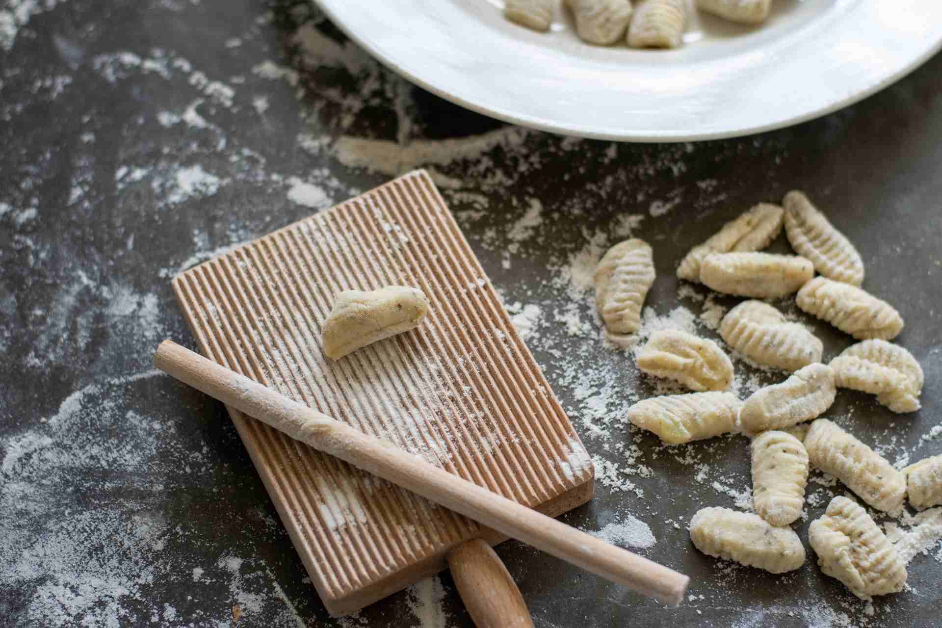 - Zet het gnocchiplankje schuin en rol de gnocchi van boven naar beneden over de ribbels van het plankje.