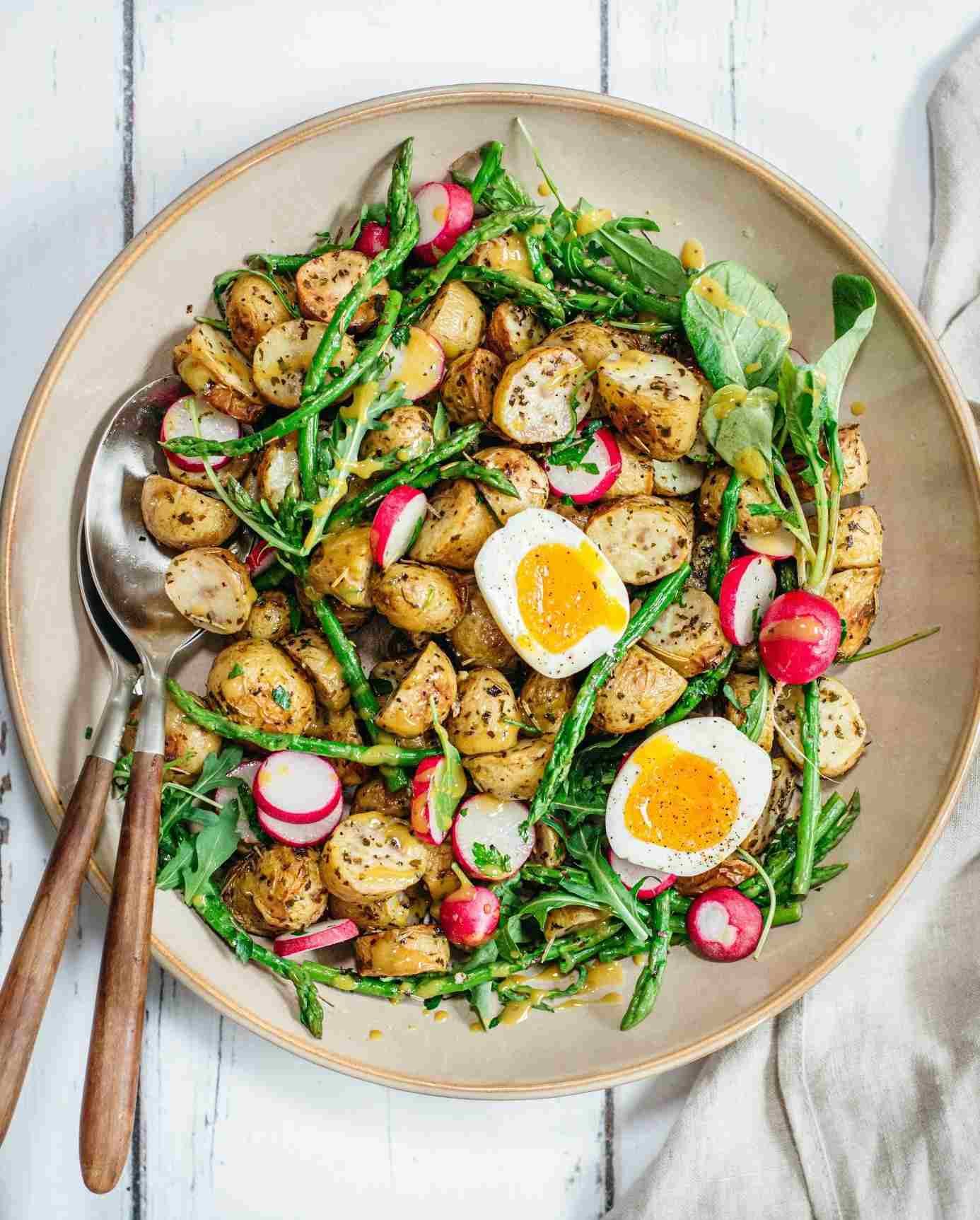 - Voeg, als de krieltjes goed zijn, de asperges, radijsjes en rucola toe.