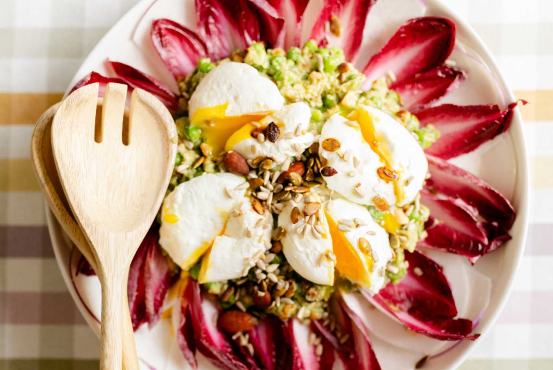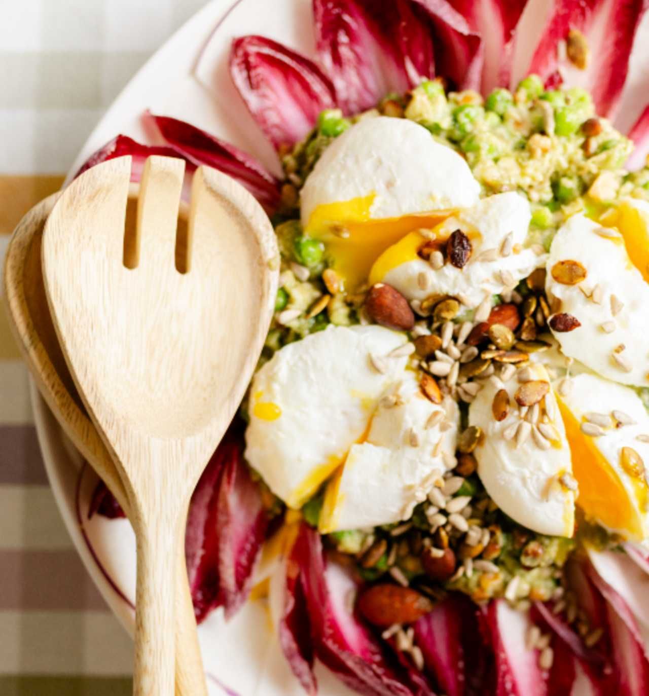 - Schep de groene spread in het midden en leg de gepocheerde eieren erop.