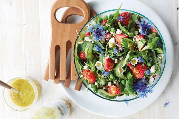 - Verdeel de aardbeien over de salade en verkruimel de feta erover.