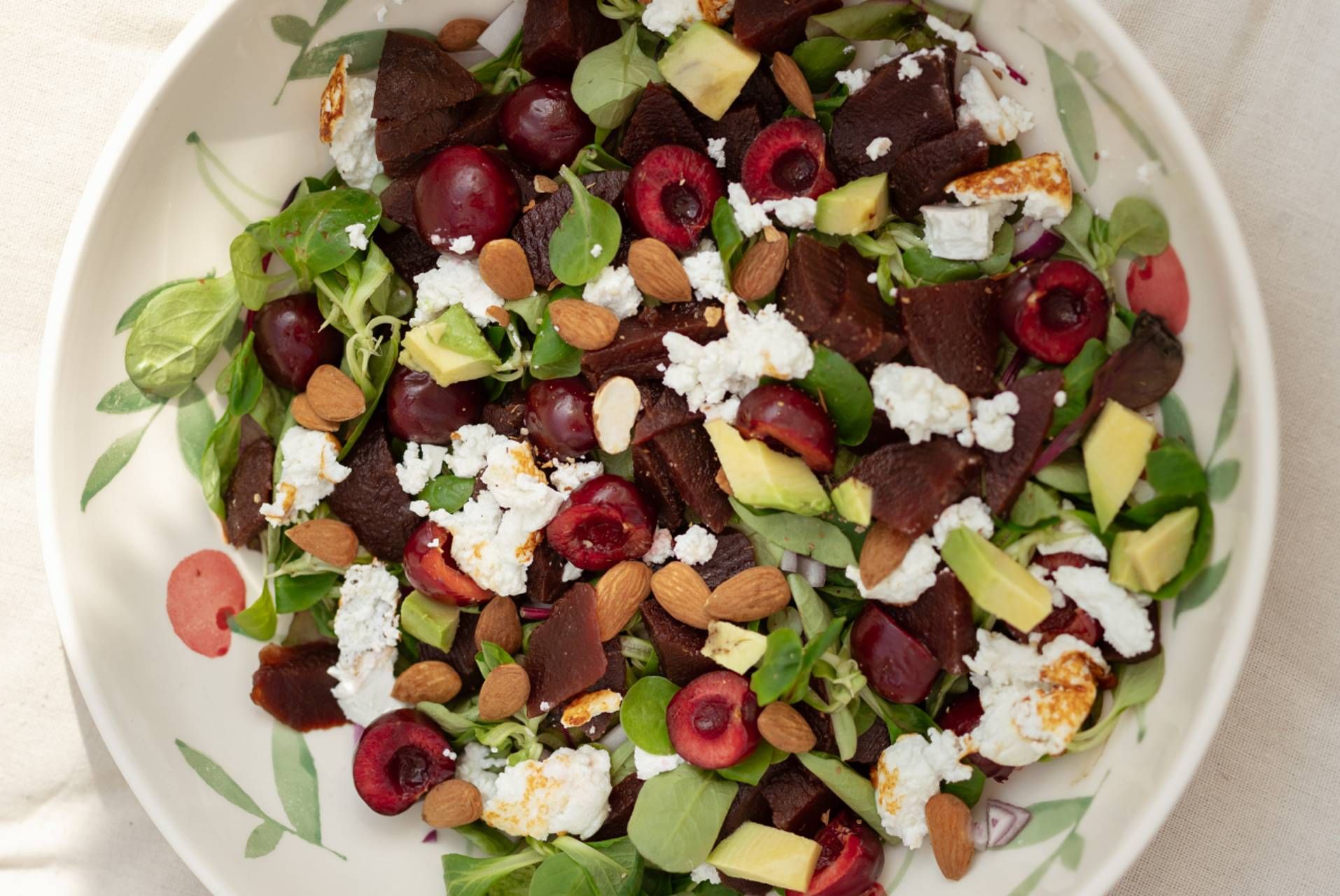 - Verdeel de bieten, avocado, ui, kersen en amandelen over de sla.