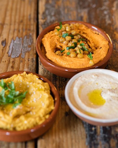 Hummus met geroosterde paprika, harissa en knapperige kikkererwten