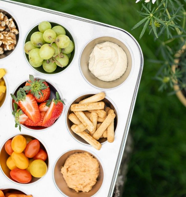 Doe verschillende soorten fruit, rauwkost, noten, olijven en dips in de muffinvorm. Zo kan je alles in één keer mee naar buiten nemen en heb je geen aparte bakjes en schaaltjes meer nodig. Dat scheelt sjouwen!
