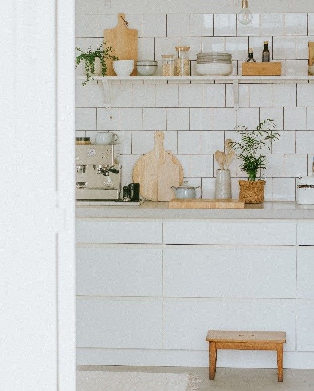 Voor de keuken is wit ook een ‘veilige’ keuze. Je kunt ook hier door de kleur en het materiaal van je accessoires een bepaalde sfeer creëren. Hout en bamboe zorgen voor een warme uitstraling, terracotta heeft een mediterrane ‘look’ en metaal meer modern.
