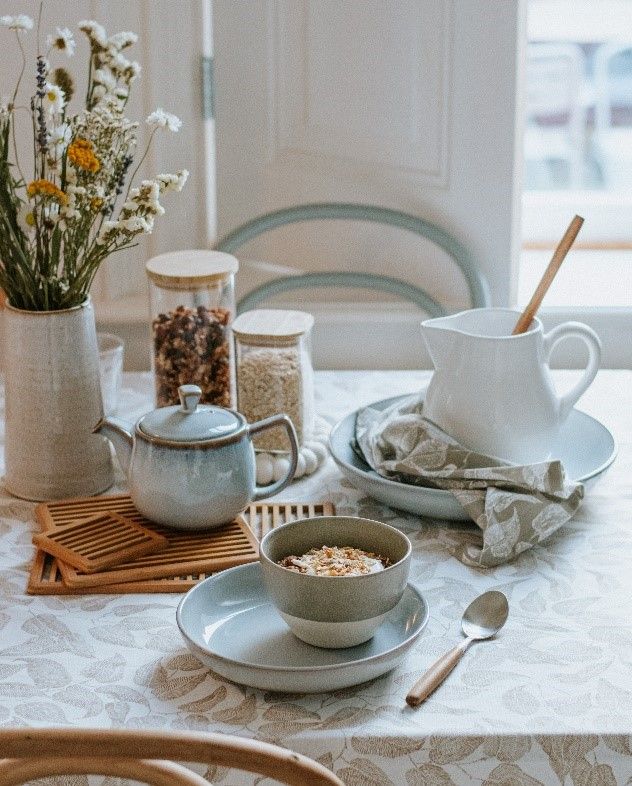 Om je dag rustig te beginnen, kan je aan de ontbijttafel het best ook kiezen voor rustige, natuurlijke kleuren bijvoorbeeld van het tafelkleed. Prettig om mee wakker te worden!